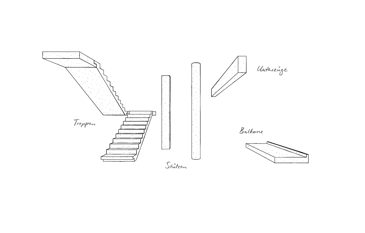 Das zeit- und materialaufwändige Vor-Ort-Einschalen, Bewehren und Betonieren entfällt. Stattdessen werden die Betonelemente fertig und just-in-time geliefert.