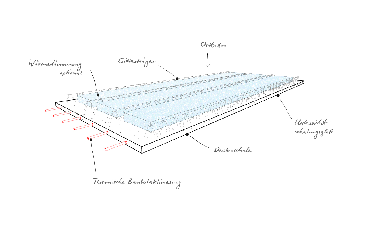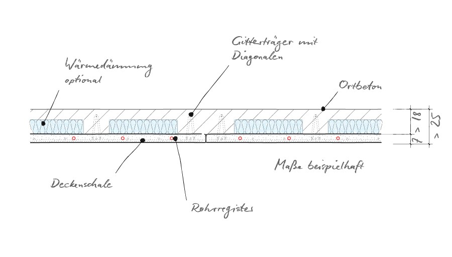Eine optional eingebaute zusätzliche Wärmedämmung zwischen den Gitterträgern richtet die zum Heizen eingespeiste Wärme gezielt nach unten und verhindert Wärmeverluste nach oben.