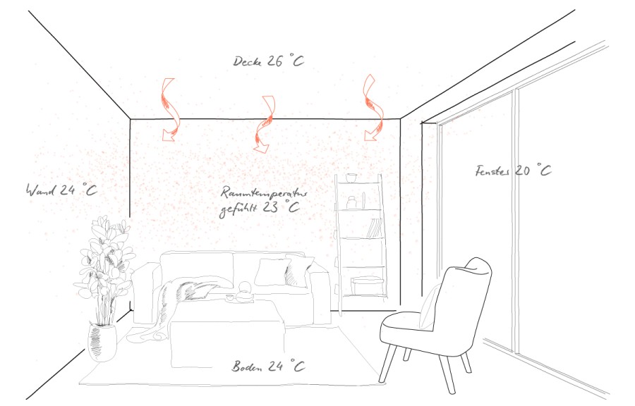 Der Fußboden, das Sofa, der Stuhl etc. sind warm und das empfinden wir als sehr angenehm. Deshalb kann die gemessene Lufttemperatur bei Wärmewellenheizungen ca. 3 °C niedriger liegen als bei Konvektionsheizungen: Das Thermometer zeigt 20 °C, und es fühlt sich an wie 23 °C. Dies fördert das Wohlbefinden und spart auch noch rund 18 % Energie.