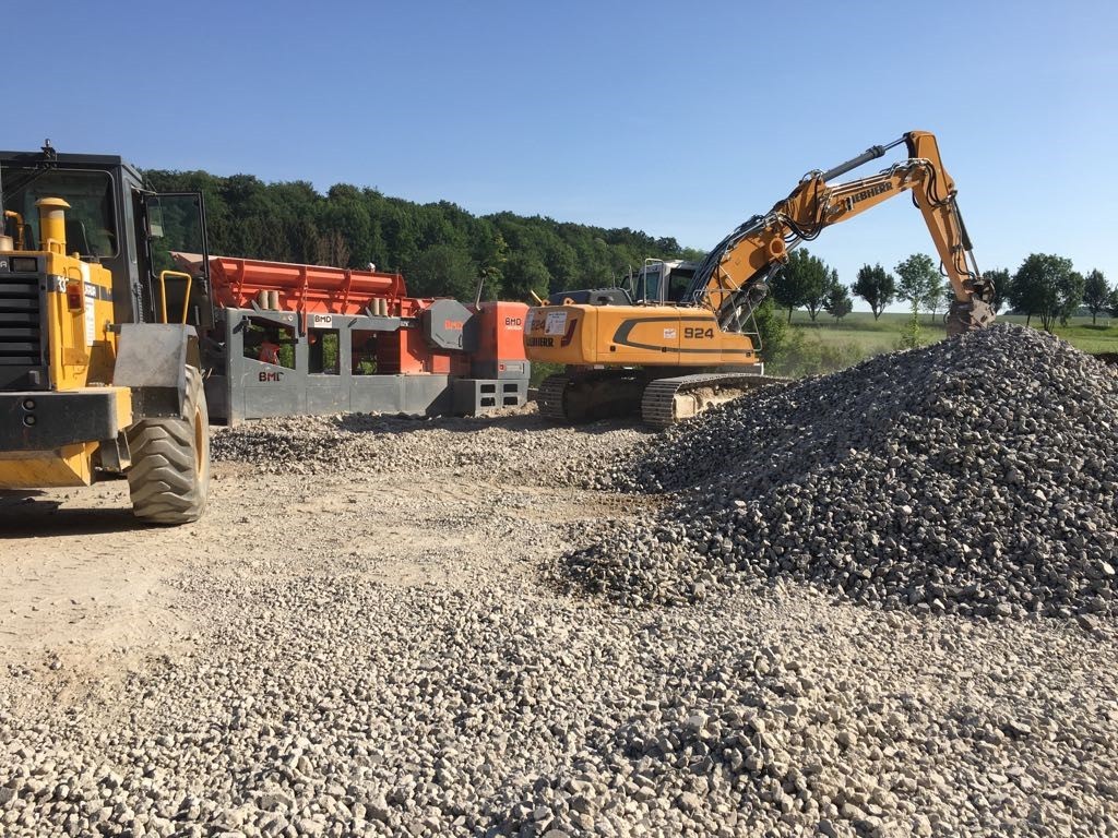 Die Betonreste aus der eigenen Produktion können mit einer speziellen, mobilen Aufbereitungsanlage mit drei Sieben einer Wiederverwendung zugeführt werden. Die so gewonnenen Sand- und Kornfraktionen lagern auf dem Betriebsgelände.