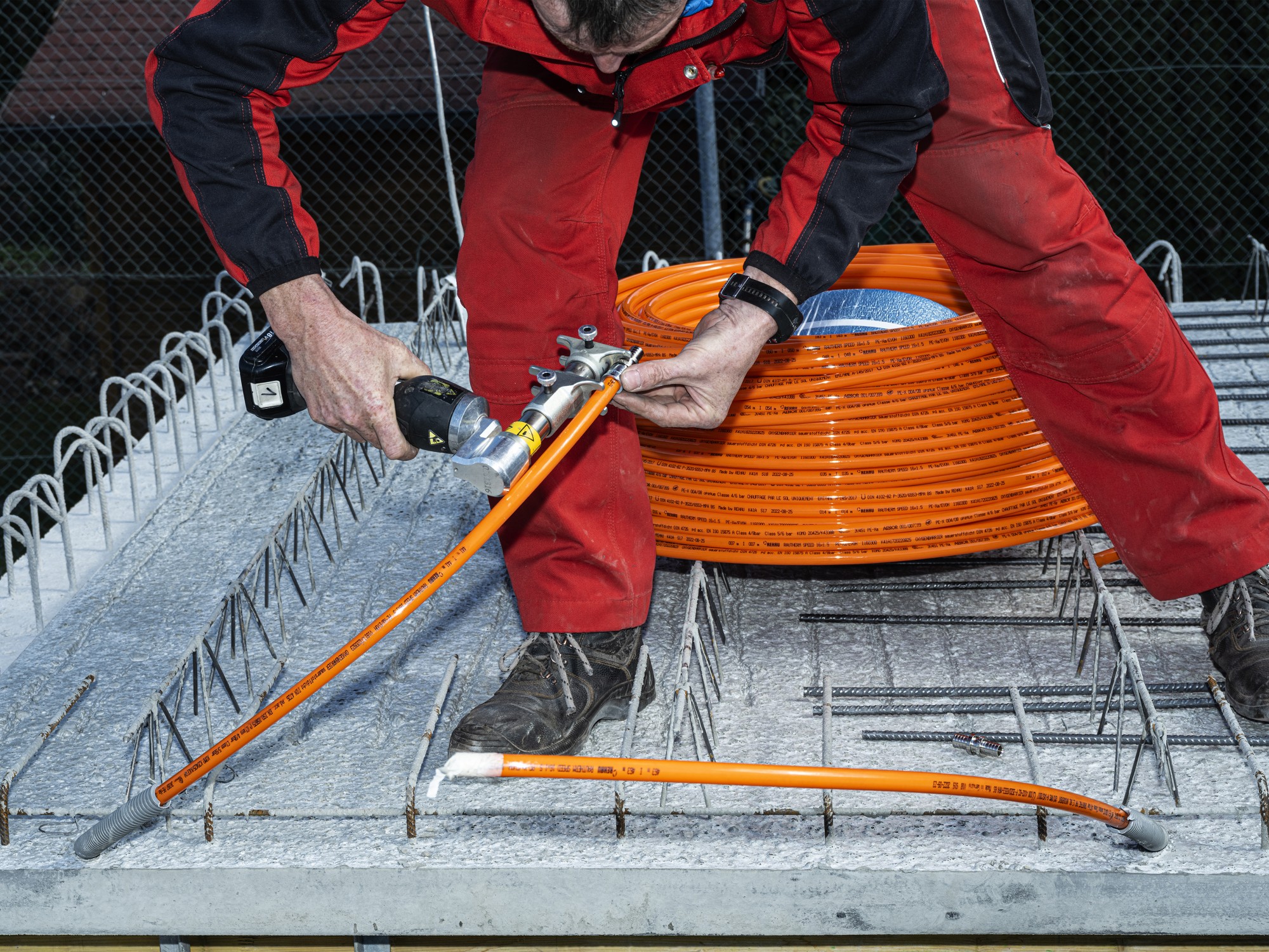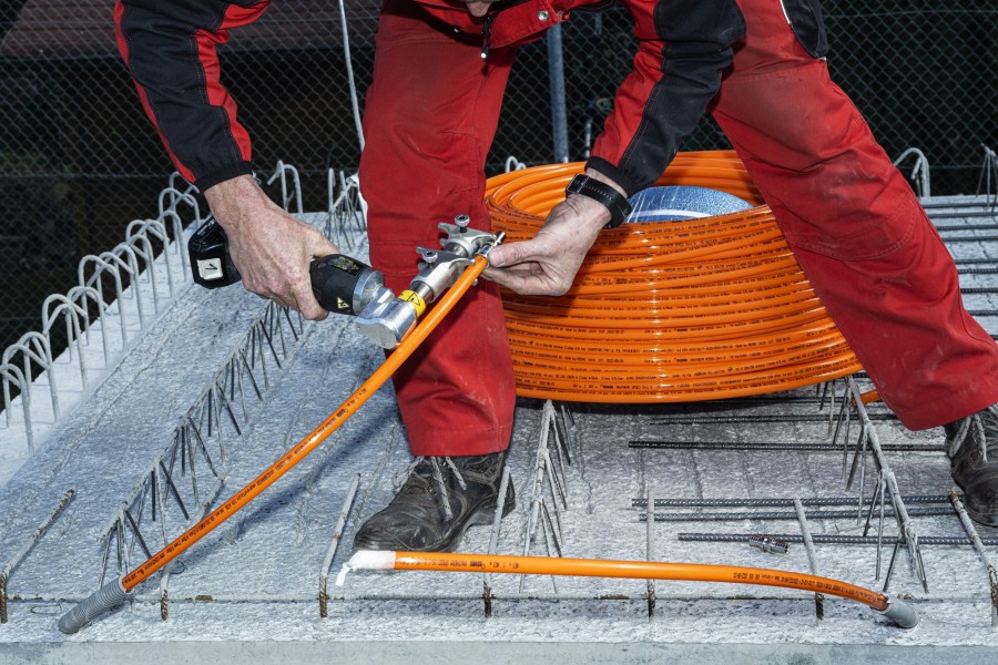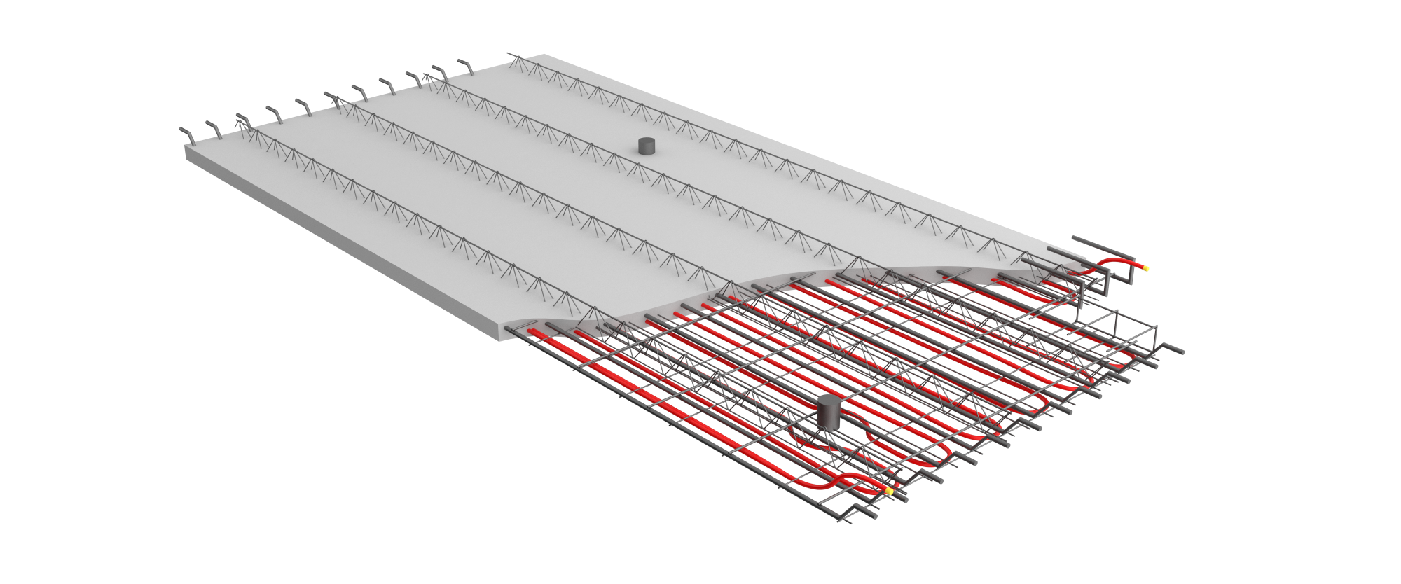 Auch in der Verarbeitung und Montage überzeugt der vorkonfektionierte Baustoff aus dem Hause der Kirchdorfer Gruppe. So enthielt die Klimadecke bereits die für die Montage und den Endzustand erforderliche Biegezugbewehrung in Längs- und Querrichtung. Zusätzlich zu den werkseitig angefertigten Rohrregistern wurden auch beigestellte Module in die Elementdecke integriert.