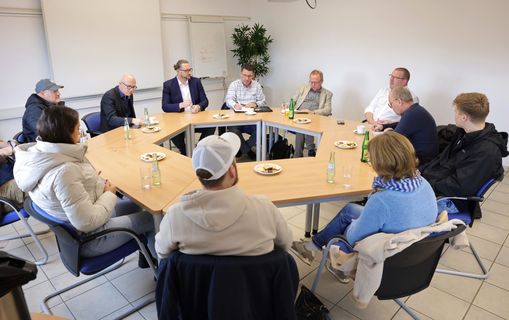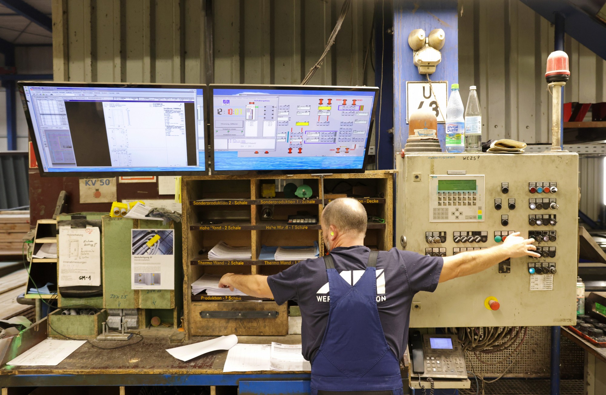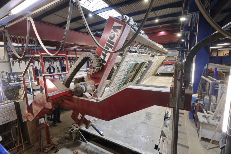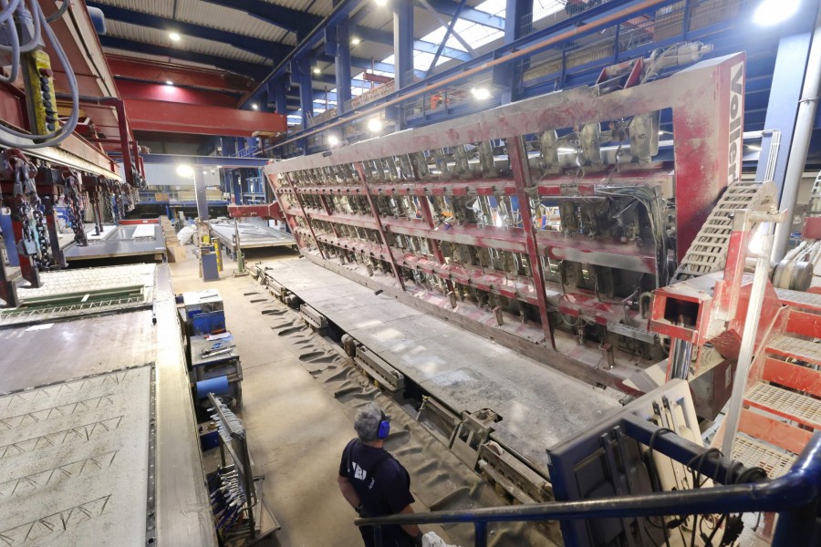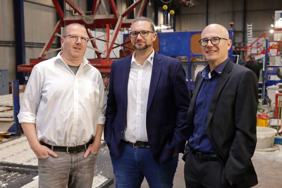 „Und eben weil man mit einer möglichst hohen Zahl an verlässlichen Parametern bauseitig operieren wollte, war die Nutzung unserer Syspro-Klimawände so naheliegend. Die exakt ausführbare Qualität der Bauteile spielte eine große Rolle“, bestätigt Ralf Nienhaus beim Gespräch mit den Medienvertretern im Bedburger Werk. „Im Vergleich zu konventionellen Ortbetonwänden lassen die Doppelwandelemente mit dem auf der Baustelle auszubetonierenden Kern nur ein Minimum an Baufeuchteeintrag zu“, erläutert der technische Leiter das lückenlose Netz an Heiz- und Kühlrohren, das in der gesamten Gebäudehülle je nach Sonnenstand sogar partiell steuerbar ist.