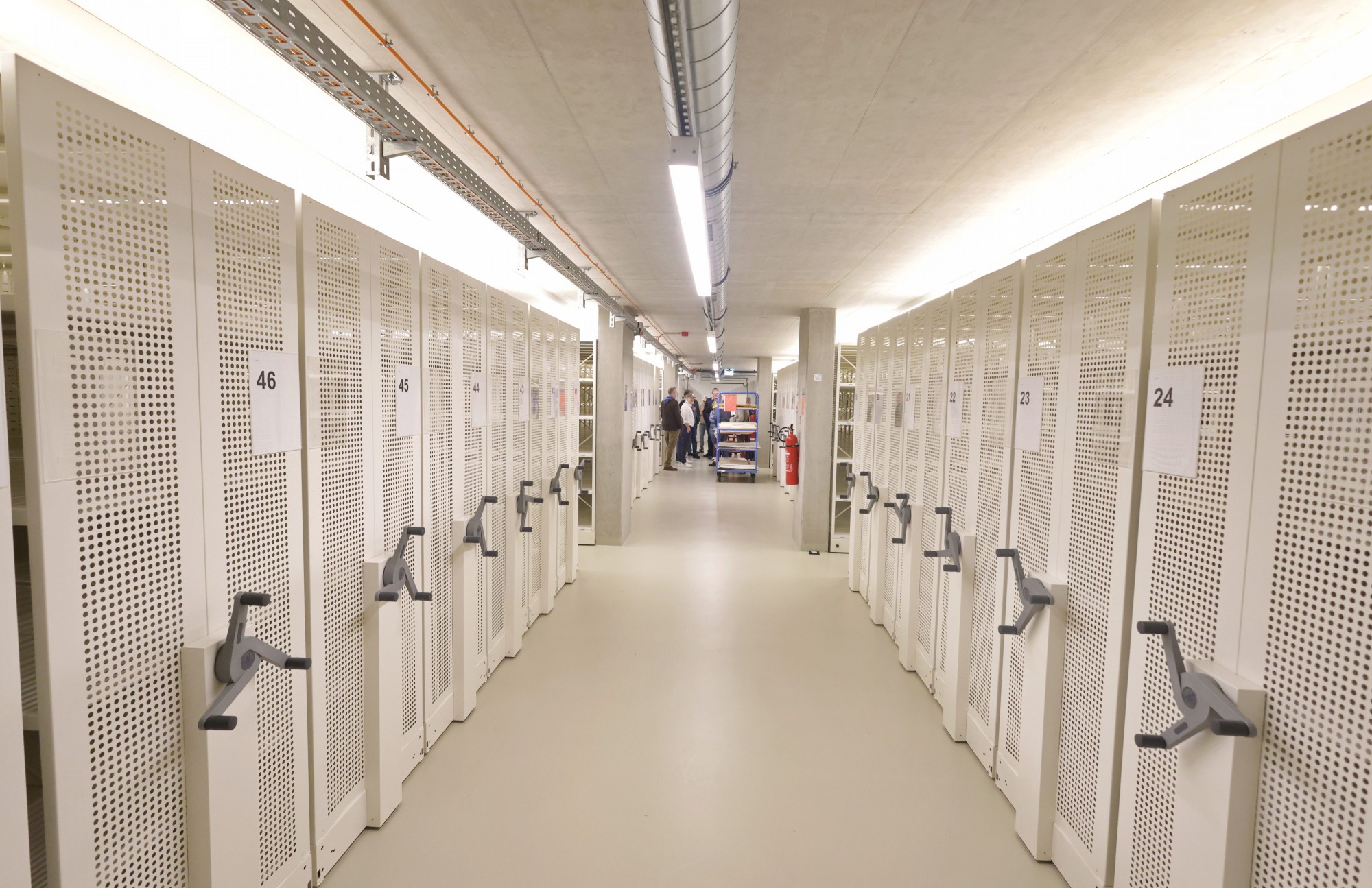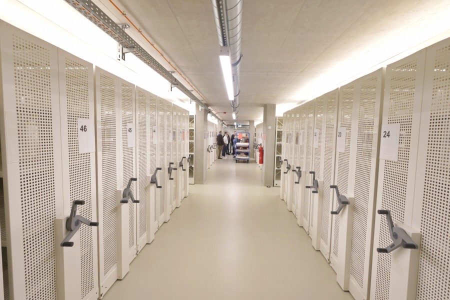 58 Regalkilometer und 460 Planschränke stehen als Lager für die wertvollen Dokumente bereit. Lufttemperaturen zwischen 16 bis 22° C und eine Luftfeuchtigkeit zwischen 40 und 55 Prozent sorgen für ein sicheres Konservierungsklima. Für den Bestand an Filmmaterial gelten mit -18° C noch sogar noch einmal besondere Lagerbedingungen. Insgesamt sind es neun unterschiedliche Klimazonen im gesamten Gebäudeensemble.