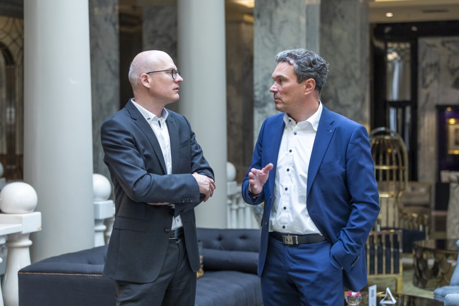 Syspro-Geschäftsführer Dr.-Ing. Thomas Kranzler (l.) im Gespräch mit Matthias Schurig, dem Vorstandsvorsitzenden der Syspro-Gruppe Betonbauteile e.V. und seines Zeichens zudem Geschäftsführer der Betonwerk Oschatz GmbH.