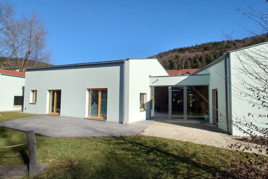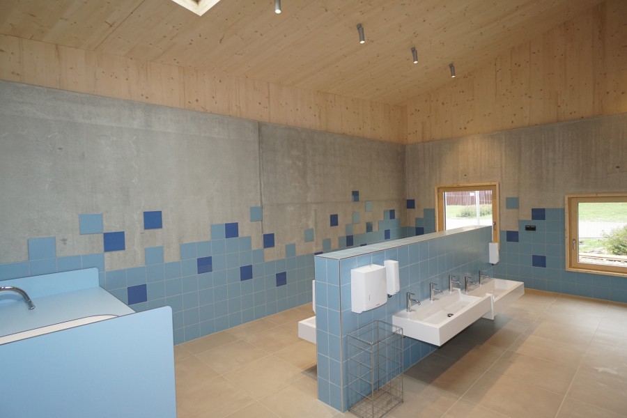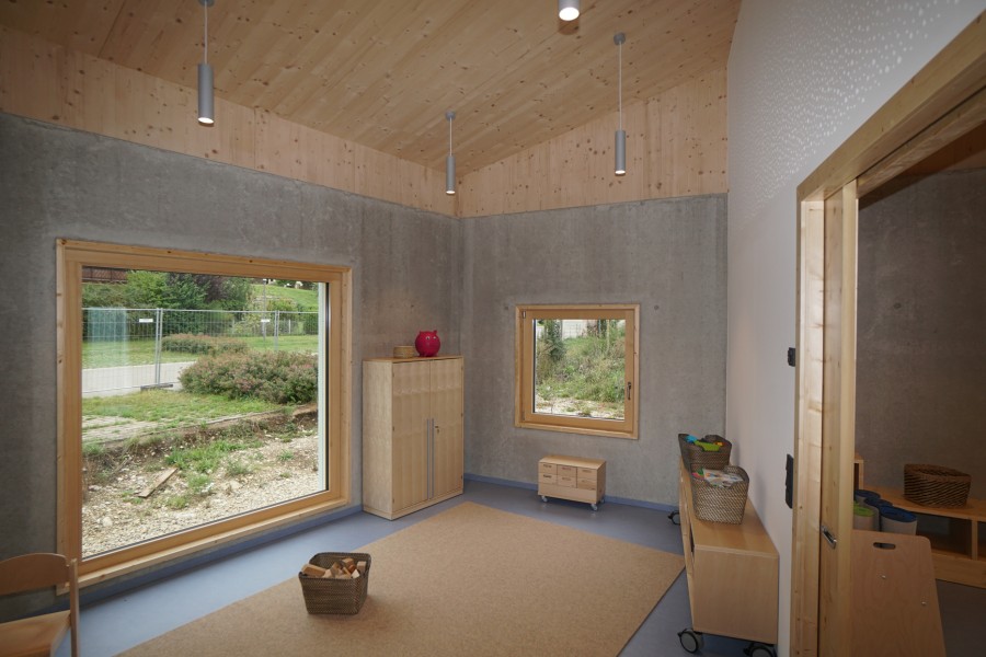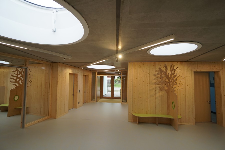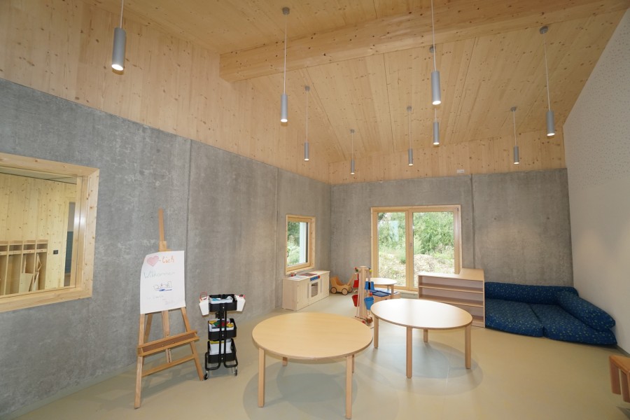 Der Wechsel hin zu einem Massivbau war im Planungsprozess auf Basis zweier Vorgaben gefallen. Die Gemeinde, erinnert sich Munz, wollte im Bodenbereich keinen Holzbau, da man befürchtete, bei einem eventuellen Wasserschaden aufwendige Sanierungen durchführen zu müssen. Und das Baurechtsamt verlangte für den „Dorfplatz“ eine nicht brennbare Decke, weil dieser den Fluchtweg aus den Gruppenräumen bildete.
