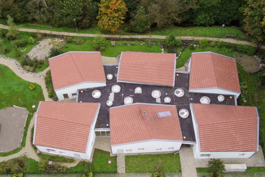 Architektonisch bildet der geschlossene Komplex ein Ensemble, das aus einem 131 m² großen Flachbau mit runden Lichtkuppeln in der Betondecke – dem zentralen „Dorfplatz“ – besteht. Um diesen herum sind sechs individuelle, eingeschossige und zirka 45 m² große Gruppenräume – die „Dorfhäuser“ – angeordnet.