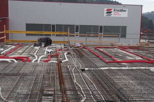 Die Firma Egon Elsäßer stellt eine große Bandbreite an vorgefertigten Betonbauteilen her – die Produktionsanlagen haben Kapazitäten bis zu 3.500 Quadratmetern täglich –, die dann „just in time“ auf die Baustelle geliefert werden. Zu der Produktpalette gehören Doppel- und Thermowände, Deckenelemente, vollmassive Balkonplatten, Brüstungen und gerade Treppenläufe. Um den Kundinnen und Kunden diese in ihrer Anwendung und Wirtschaftlichkeit anschaulich näherzubringen, entschied man sich bei dem Verwaltungsneubau für eine besondere Konstruktion: Zum Einsatz kamen neben den bekannten Elementdecken auch tragende, doppelschalige Außenwände, sogenannte Thermowände, die mit integrierter Dämmung oberflächenfertige Ansichten in Sichtbetonqualität bieten. Alle Elemente wurden mit Ortbeton ausgegossen und ergeben ein homogenes, absolut luftdichtes Gebäude, das auf einfache Weise die Vorgaben und den hohen Komfort eines Passivhauses erfüllt. Zur Raumklimatisierung wurden die vorfabrizierten Deckenelemente werkseitig mit Heiz- und Kühlleitungen versehen. Dank dieser oberflächennahen Betonkernaktivierung konnte man auf zusätzliche Heizflächen in den Räumen verzichten und trotzdem individuelle Raumtemperaturen ermöglichen.