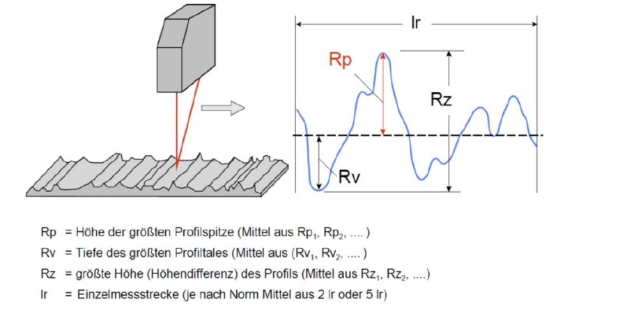 Definition der Parameter Rz, Rp und Rv nach DIN EN ISO 4287 (Foto: Prof. Dr.-Ing. R.-R. Schulz)