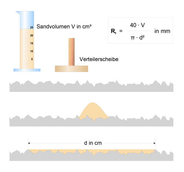 Das Sandflächenverfahren (alternative Bezeichnungen sind „Sandfleckverfahren“, „Sand Patch Test“ oder „Kaufmann-Verfahren“ nach N. Kaufmann, der diese Methode in Anlehnung an eine englische Prüfvorschrift hierzulande eingeführt hat) wird zur volumetrischen Bestimmung der Rauheit bzw. Textur einer Oberfläche eingesetzt. So lassen sich damit zum Beispiel der Zustand von Verkehrsflächen im Straßenbau erfassen oder die Rauheit des Beschichtungsuntergrunds bei Betoninstandsetzungen ermitteln. Mithilfe des Sandflächenverfahrens wird die mittlere Rautiefe der zu prüfenden Oberfläche bestimmt. Hierfür schüttet der Prüfer eine bestimmte Menge feinen Sand auf die saubere und trockene Oberfläche und verteilt diese mit einer Holz- oder Metallscheibe zu einem kreisförmigen Fleck, bis die Vertiefungen in der Oberfläche gefüllt sind. Anschließend bestimmt er den Durchmesser der Sandflecks. Die mittlere Rautiefe Rt ist der Quotient aus dem Volumen des verteilten Sands und dem Durchmesser des Sandflecks.