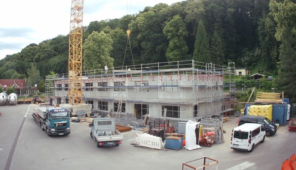 Obwohl der serielle Montageprozess im Werk und auf der Baustelle technisch klar definiert war, stellte der Anbau die Beteiligten vor einige Herausforderungen. Die Zufahrt im Wohngebiet war eng, die großformatigen Elemente mussten präzise eingehoben werden. Trotz dieser Bedingungen gelang es, sämtliche Wände innerhalb von rund vier Tagen zu stellen.